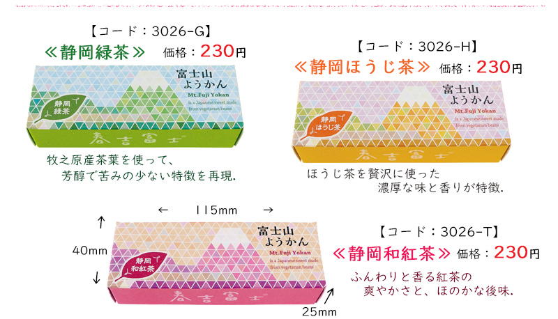 | 静岡県産の緑茶、ほうじ茶、和紅茶を使った 「富士山型」 の可愛いようかん. 6個入はギフトボックス入りでちょっとお得! | ||