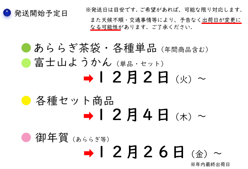 | 商品別の「発送開始予定日」一覧です. 予定日はあくまで目安ですので、配達日を指定する場合は、お早めにご連絡ください. | ||