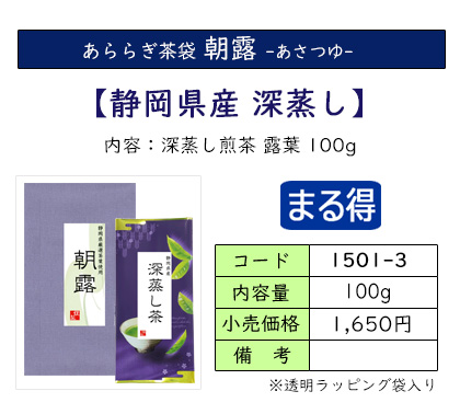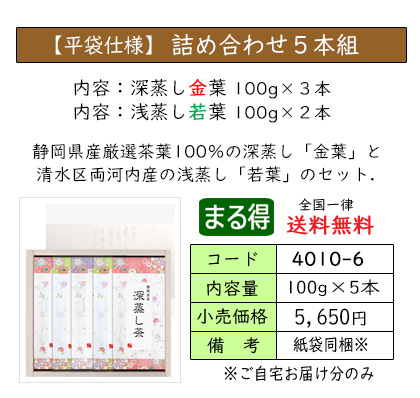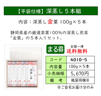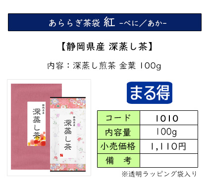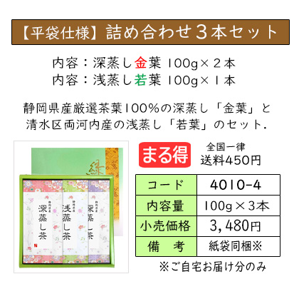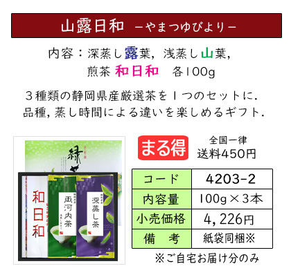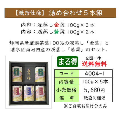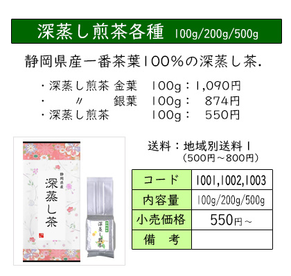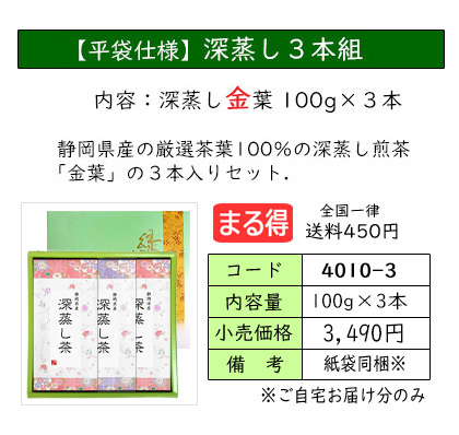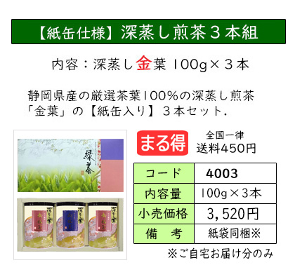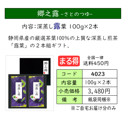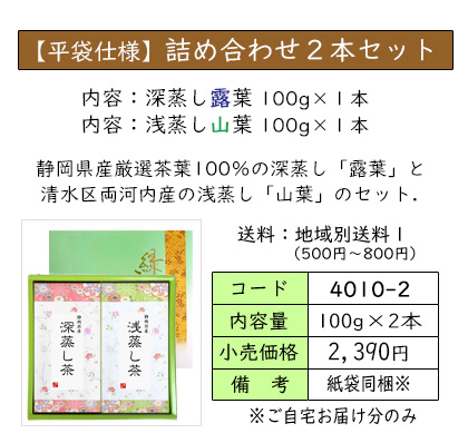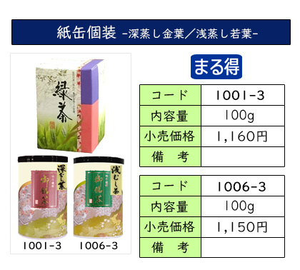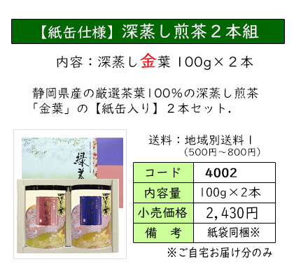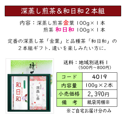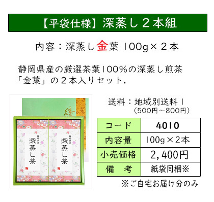 | お茶をいれたときの濃い緑色と、渋味や苦味が少なく、コクと甘味が特長の深蒸し茶のセット。 深蒸し茶がお好きな方におススメの、定番ギフトです。 | ||