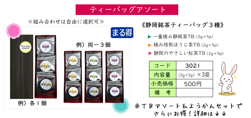 | 年始のご挨拶などに便利な簡易ギフト&人気TB3種類の詰め合わせボックス. お茶の種類は変更可能ですので、ご希望があればお気軽にお問い合わせください. | ||