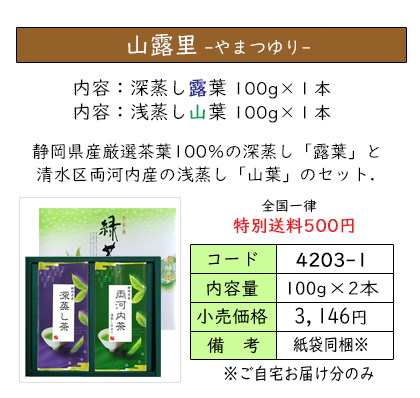 | 高山地ゆえの鮮烈な山香、とろりとした旨味と渋みの調和は、浅蒸し仕立ての煎茶の醍醐味。 深蒸し茶との飲みくらべも 是非 お楽しみください. | ||