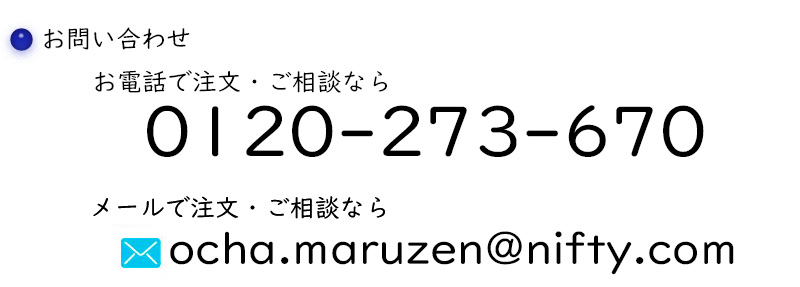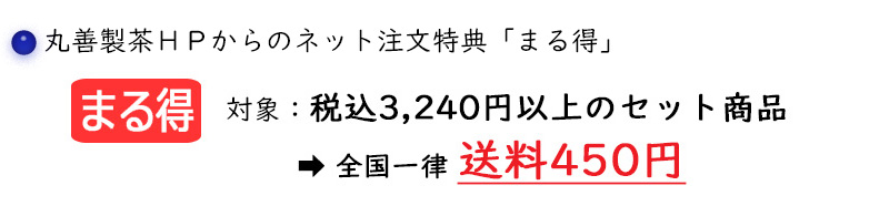 | 当ページをご閲覧の上、下部の【注文書】よりご注文を頂くと、ネット注文特典「まる得」が適用されます. またお電話でのご注文の場合は「丸善製茶の企画ページを見た」とご申告ください. | ||